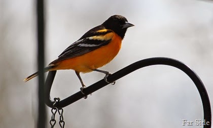 The Orioles have arrived, but not in mass like last year… it is still early. Grape jelly and oranges await them. The best I can tell there are five or six males.